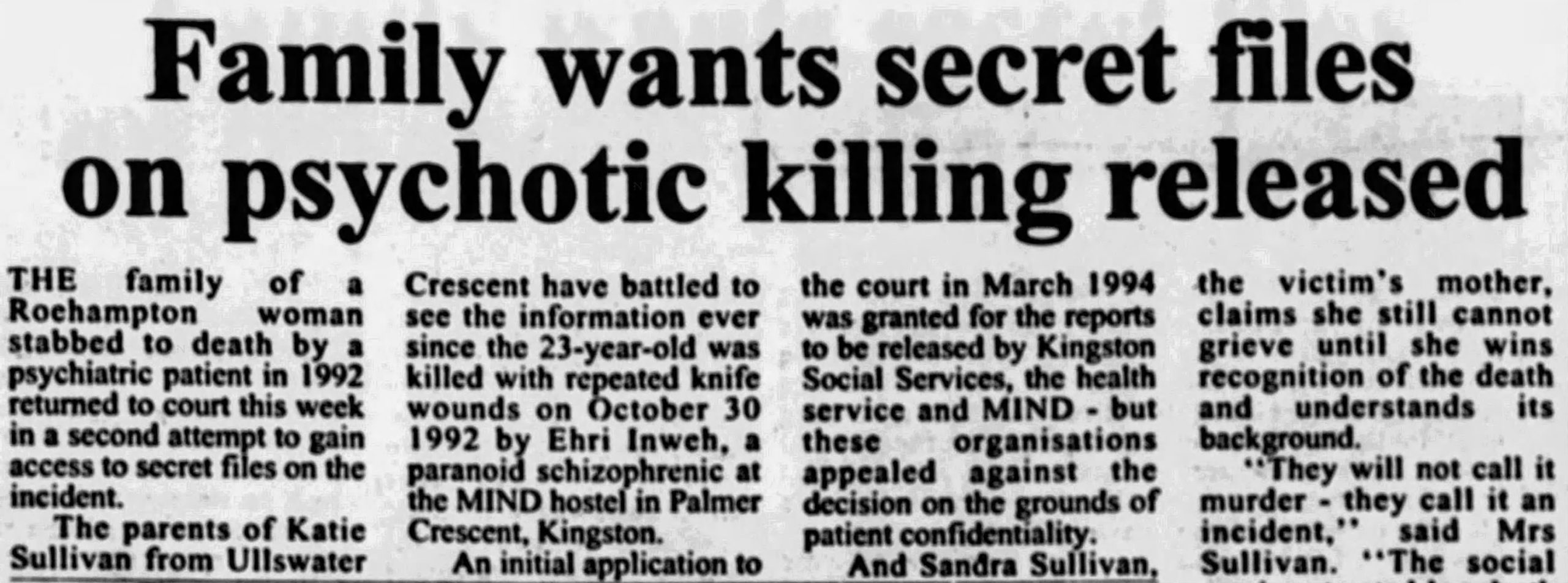 Sandra’s beloved daughter Katie, 23, a psychologist, was stabbed to death whilst on duty at a MIND rehabilitation centre in Kingston in October 1992 by a schizophrenic woman.